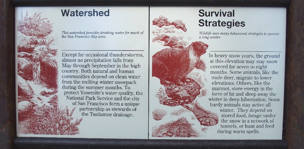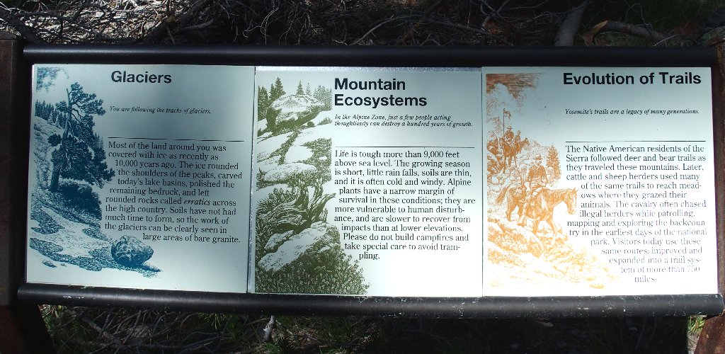 Trailhead signs introduce visitors to the Tuolumne Meadows