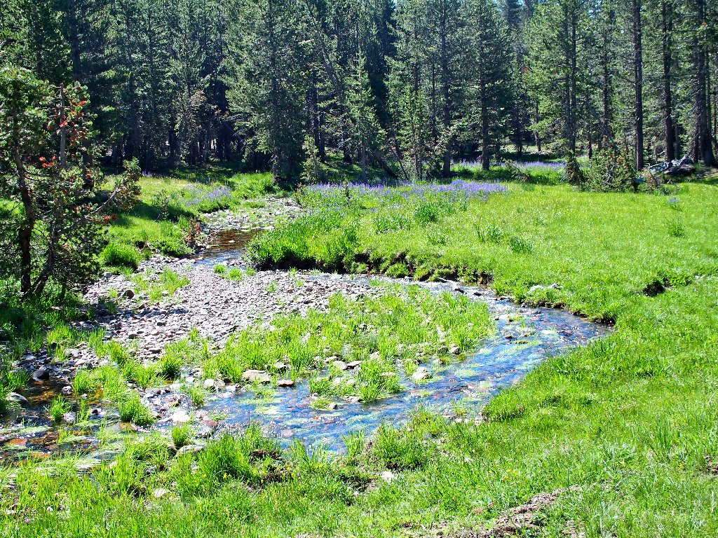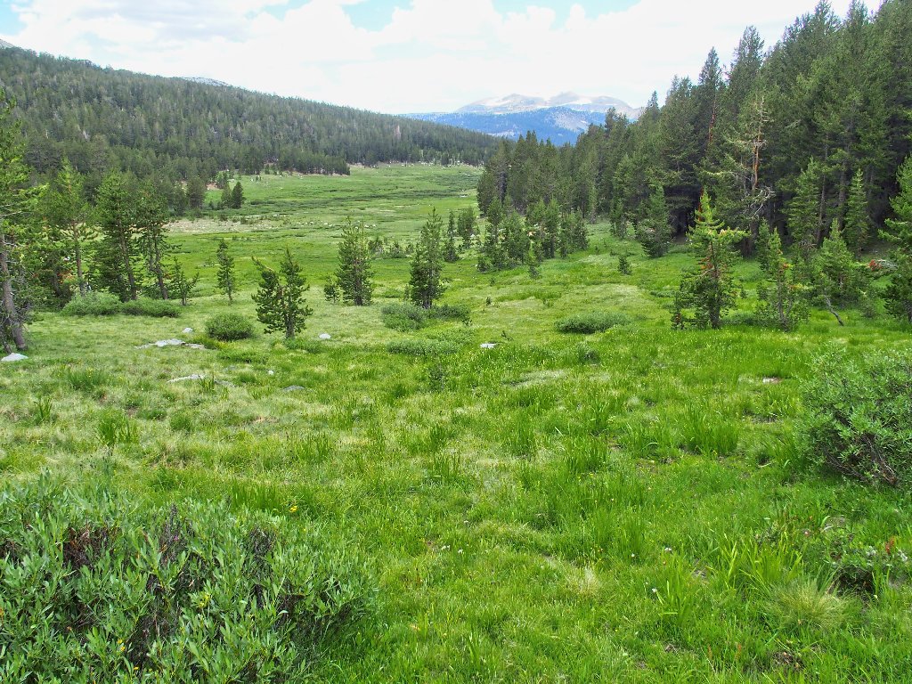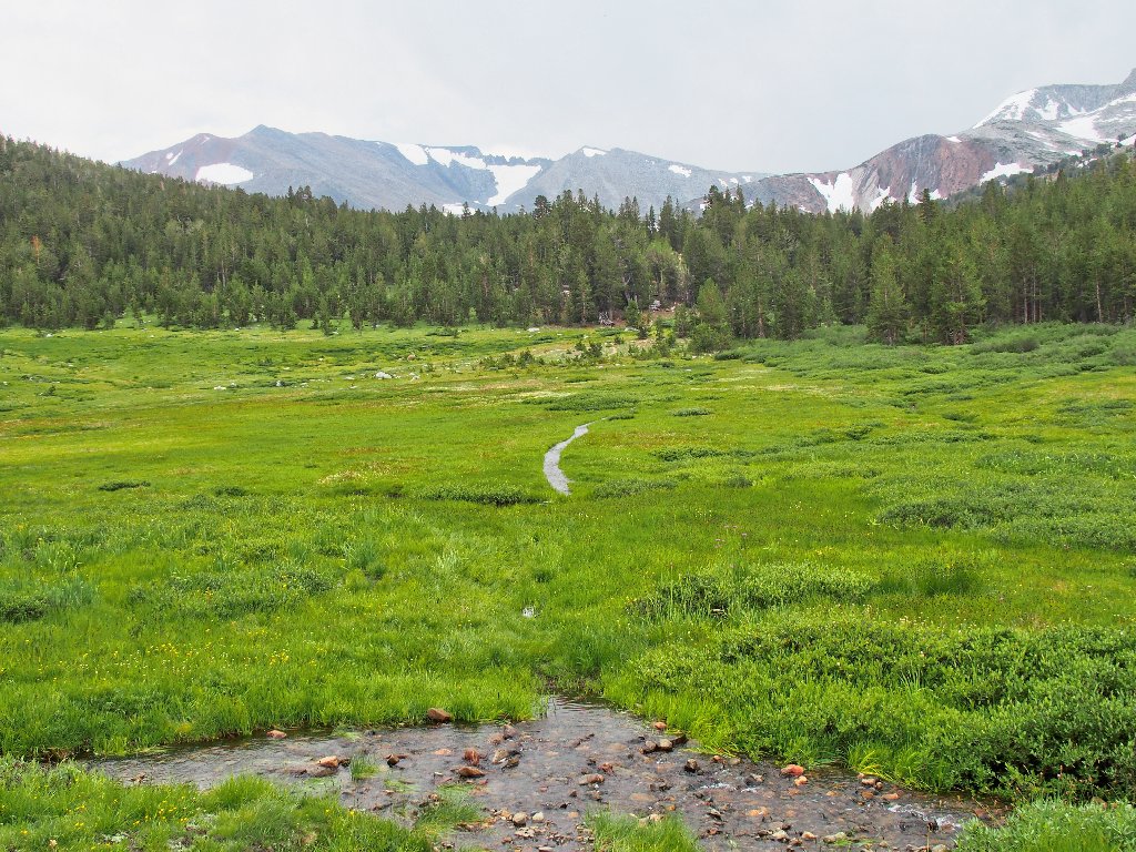 I am trying to stay above the meadow, expecting it to be quite wet down there; but eventually, hitting the green grasses seems like the thing to do.