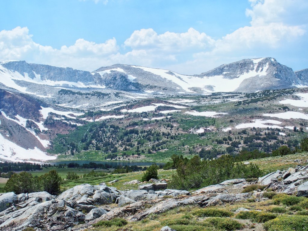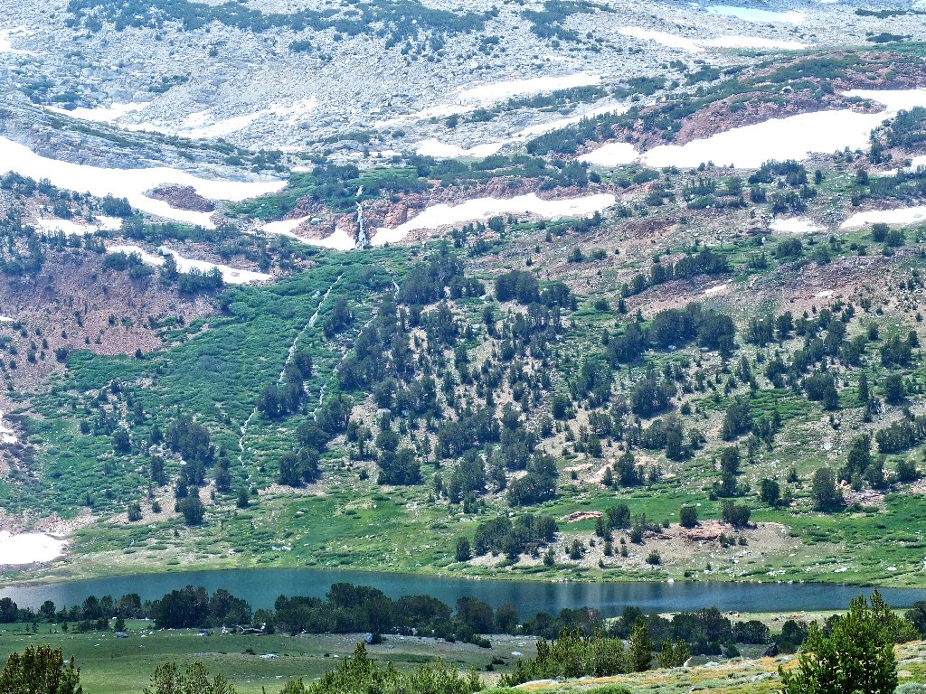 Parker Pass Lake is at the base of those cliffs