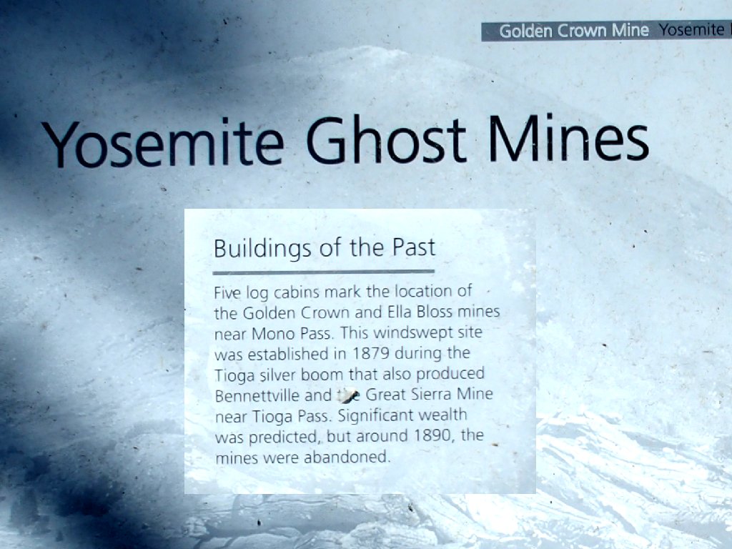 At the peak of the mining days, there were 350 mining locations in the Tioga area, including here in Bloody Canyon. Until the Tioga road was built in 1833, Bennettville and other Tioga mines were supplied by Mexican packers, first by the route up Bloody Canyon and later up Lundy Canyon.