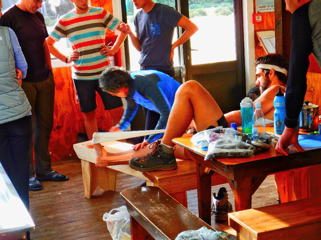 Inside the hut there is another crisis in progress. A young man has sprained an ankle while running the trail, and he is getting it taped up. Dave offers him an Ibuprofen for the inflammation, but Mr. Macho declines. Then, when the taping is finished, Dave again offers him two pills this time, which he ultimately takes.