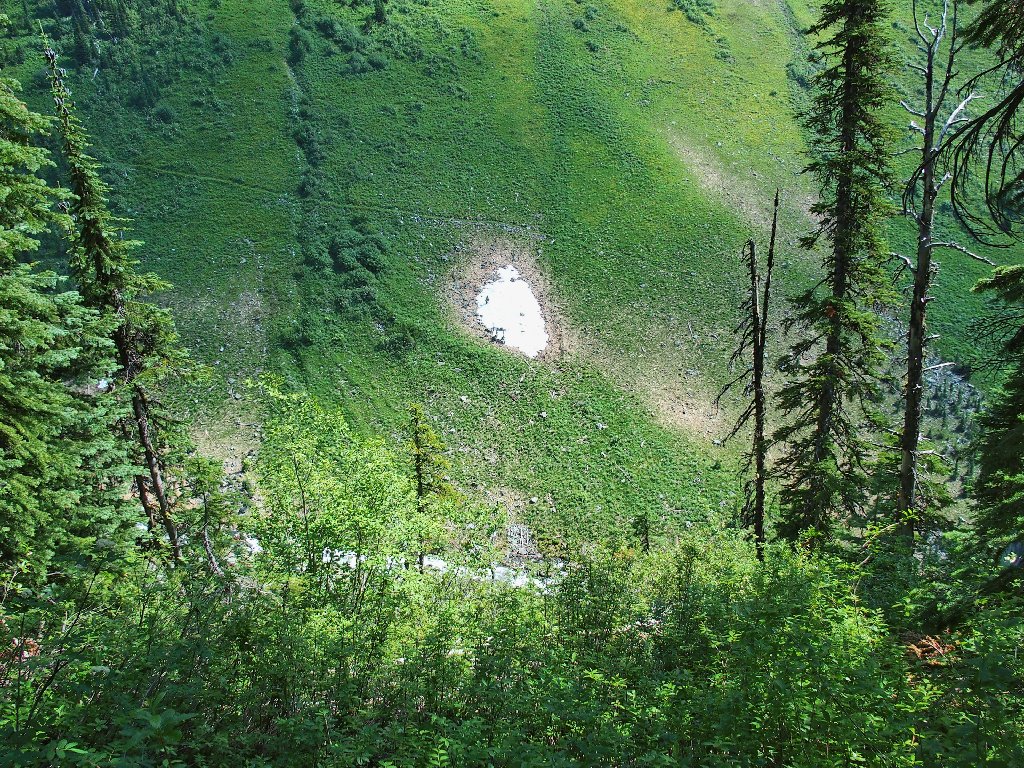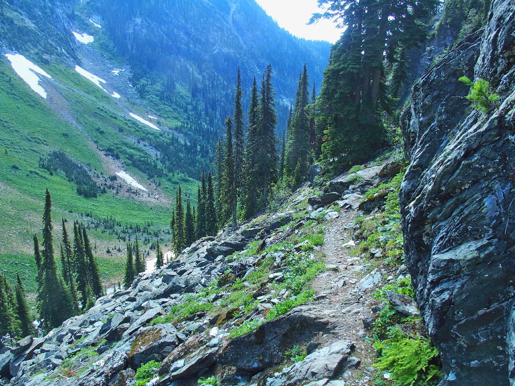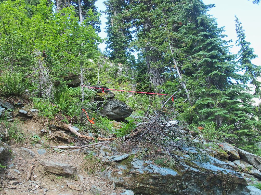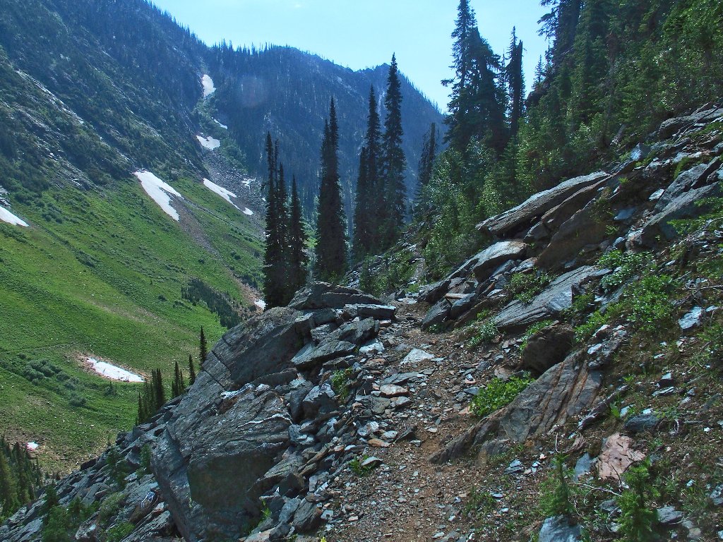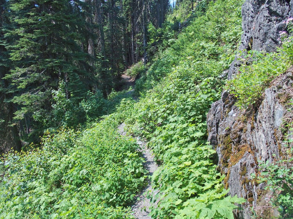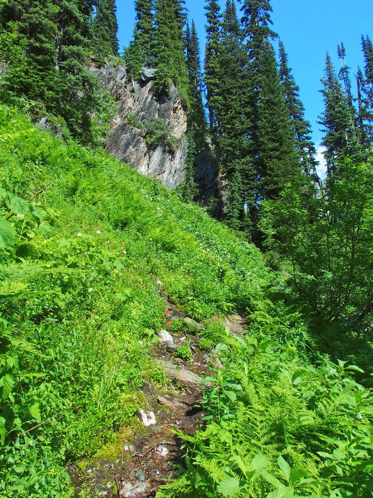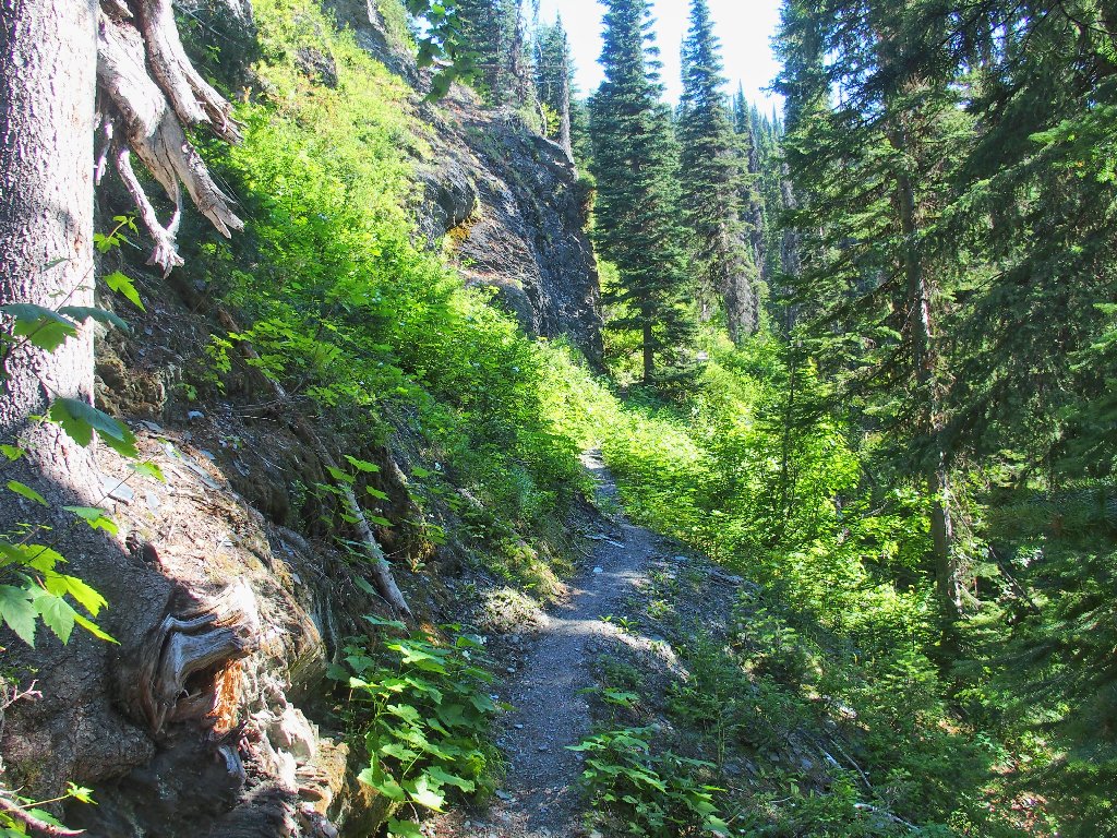 The original route traversed the other side of the canyon, where building a trail was easy. The inviting meadows on the far slope are a popular feeding area for the local grizzly bears, however; so the powers that be apparently were compelled to construct an alternative route over here instead. They didn't expend any unnecessary funding on it, though.