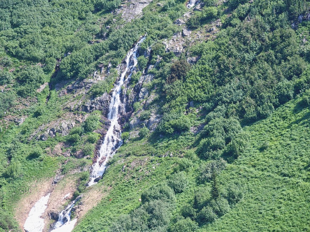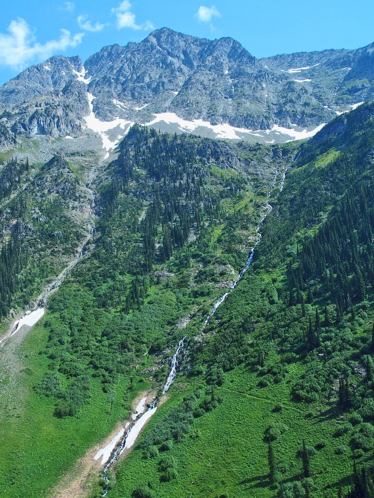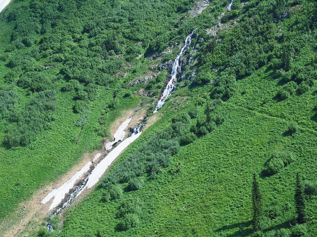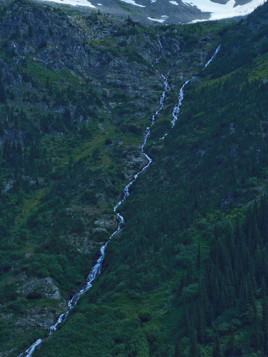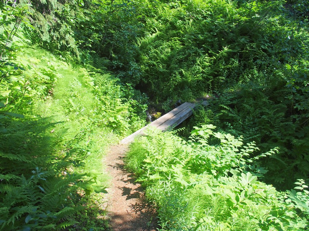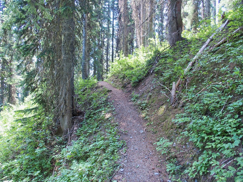 The original route traversed the other side of the canyon, where building a trail was easy. The inviting meadows on the far slope are a popular feeding area for the local grizzly bears, however; so the powers that be apparently were compelled to construct an alternative route over here instead. They didn't expend any unnecessary funding on it, though.
