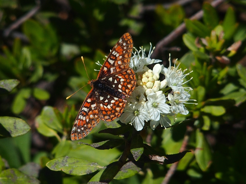 An Edith's Checkerspot likes Labrador Tea