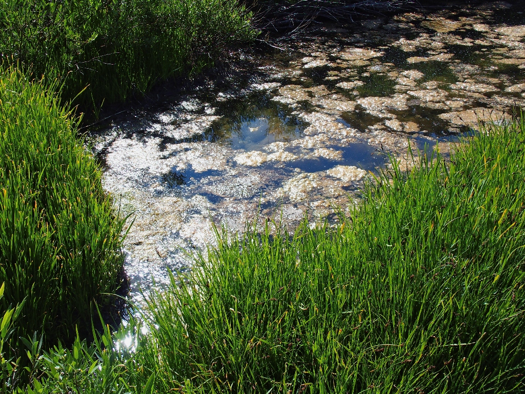 The embankment on the far side is steep and muddy, which should make for a lot of fun on the return. Reaching the lip of the creek channel, I unexpectedly find myself in the middle of a giant garden.