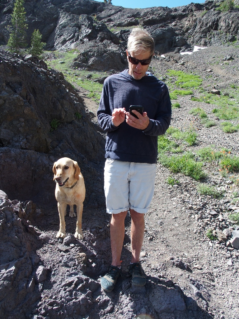 Dave is a kindred soul. Ten years younger than I, he spends about five days a week out on some trail or other. Buffy's paws don't like the sharp volcanic rock, but she is hanging in there nonetheless.