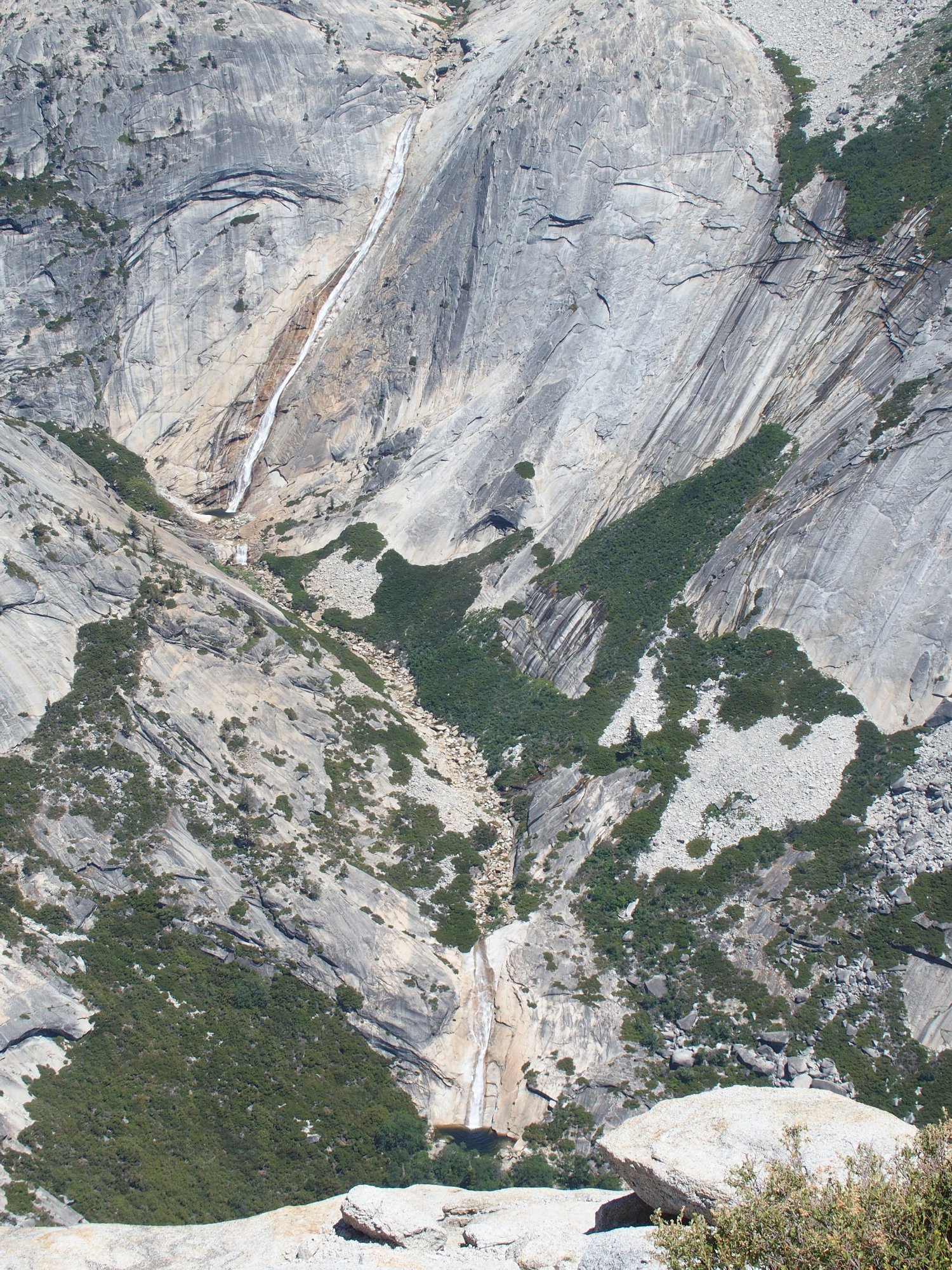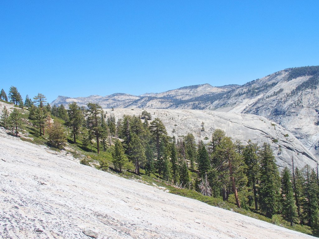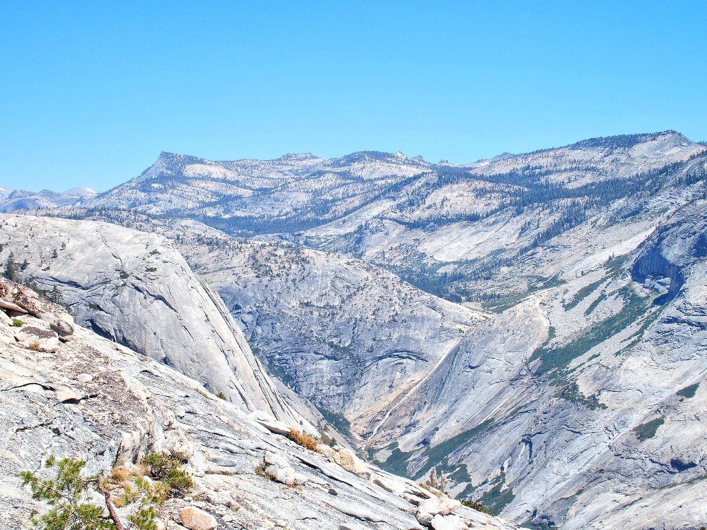 This traverse is not really dangerous, but attention to one's footing is required. The slope does drop 3,000 feet into Tenaya Canyon.