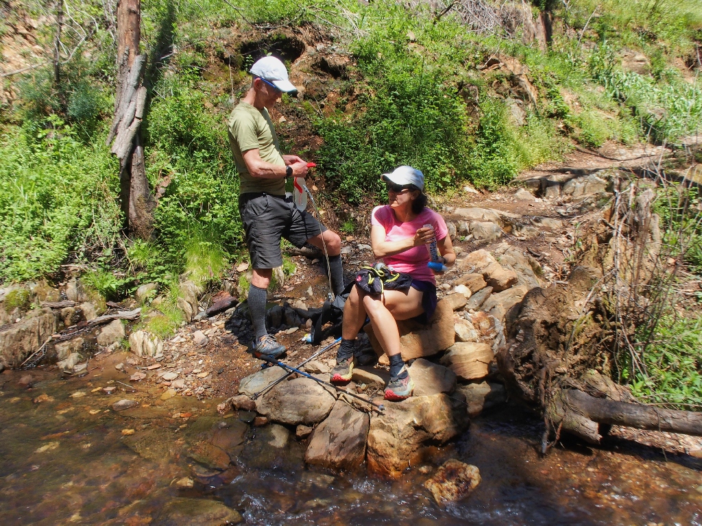 Before long, Roxanne and Eric predictably pass me again, talking about the "water" ahead. Presently I arrive at the creek crossed earlier, where Eric already is arranging to replenish his water supply. Unlike foolish me, he has a filter!
