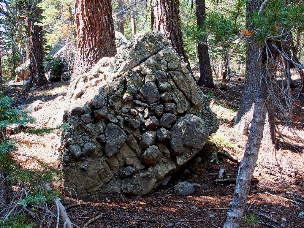 This lava flow originated at the extinct Mount Pluto, which is located six miles west of Kings Beach, at the southern tip of the Northstar complex. It was active in the Pleistocene era, about 1-2½ million years ago. During that period, Lake Tahoe's shoreline was raised up and down to as much as 600 feet above its present level.